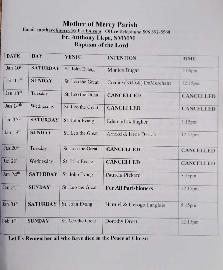 NOTE: Mass at the Juniper Community School for 2026 has yet to be scheduled. Click here for Mother of Mercy Parish Facebook Click here for the Diocese of Saint John Facebook Share this: Share on X (Opens in new window) X Share on Facebook (Opens in new window) Facebook Like Loading...